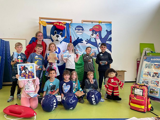 Gemeinsam mit den Teamern der DLRG erklärte Nobbi, warum man nie allein ins Wasser