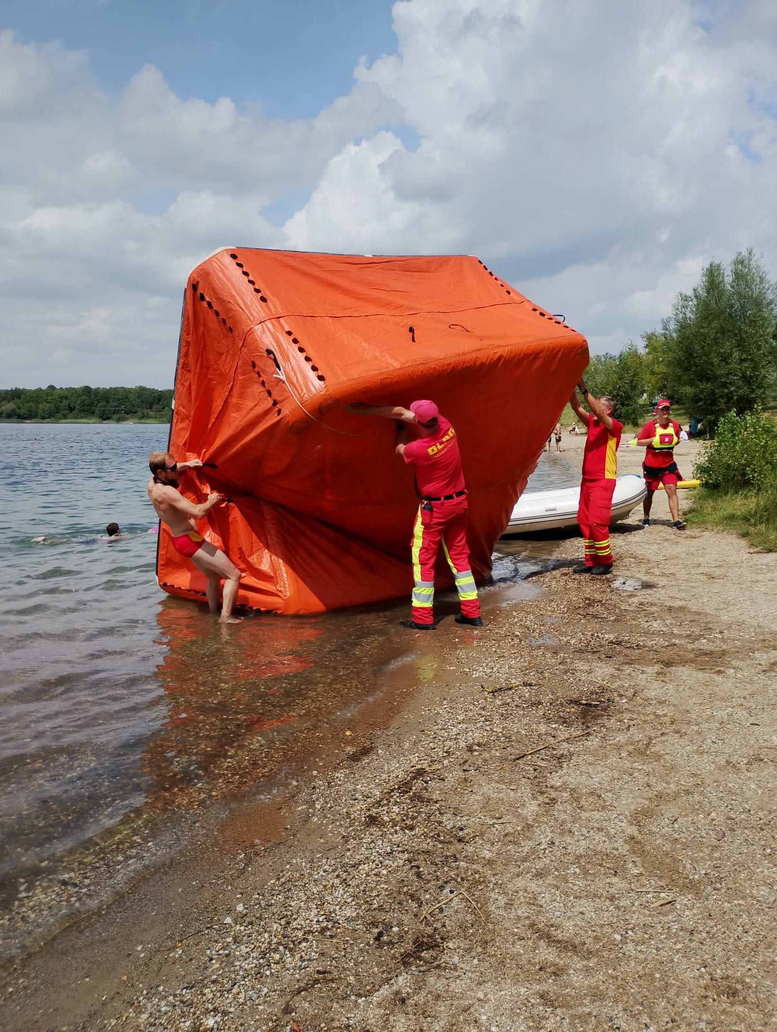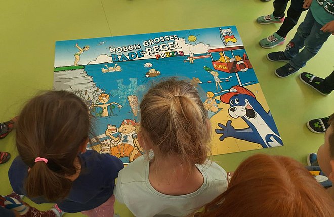 Darüber hinaus gab es die Möglichkeit, mit dem Baderegel-Riesenpuzzle spielerisch das richtige Verhalten am und im Wasser zu üben. Kinder und Eltern konnten dabei gemeinsam die Baderegeln zusammensetzen und so ihr Wissen auffrischen. Ergänzend dazu erklärten die Teamer und JET‘is der Ortsgruppe auch die wichtigsten Sonnenregeln, um aufzuzeigen, wie man sich im Sommer nicht nur im Wasser, sondern auch an Land gesund und sicher verhält.